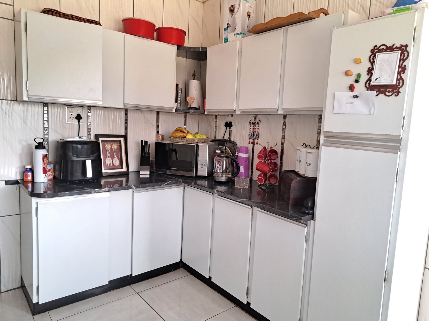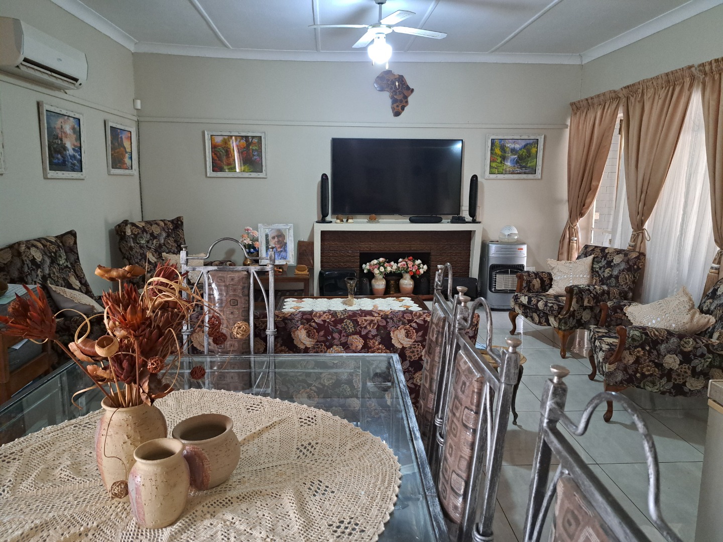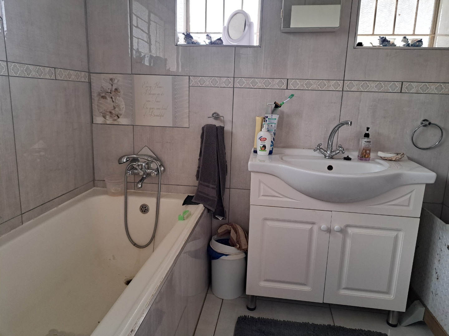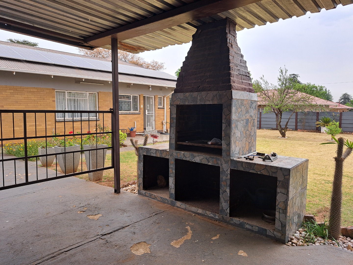 A 3 bedroom family house set on a big stand, close to Carleton Jones High School. Move in ready and very neat. Braai outside for weekend visits. 2 Outside rooms and single garage. 12 Solar Panels. 2 Jojo tanks.