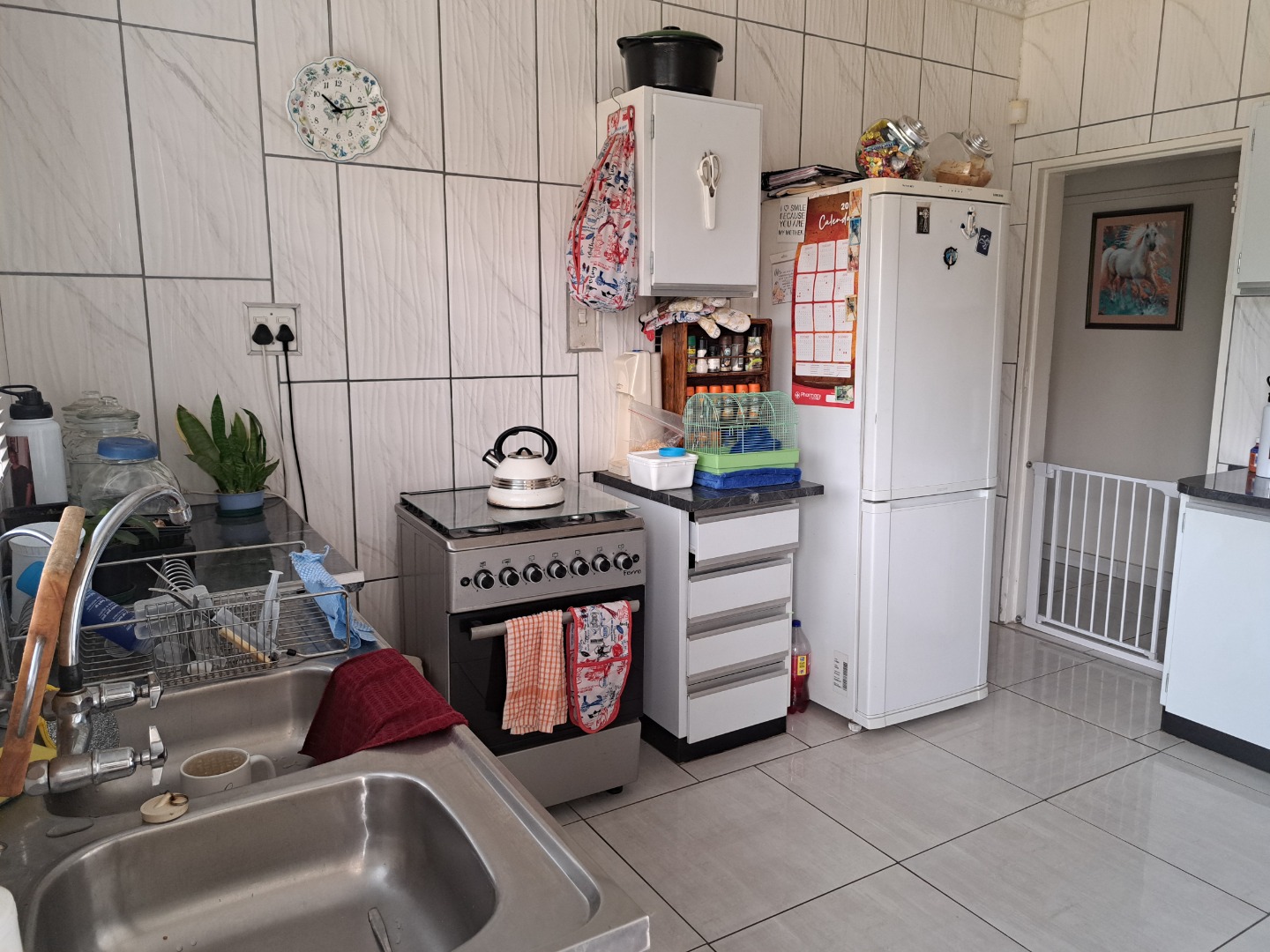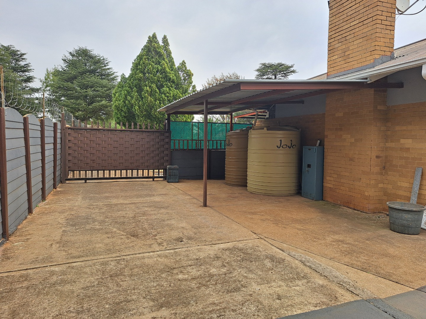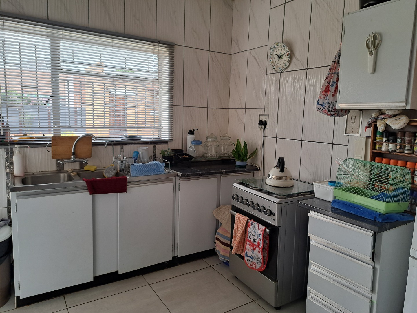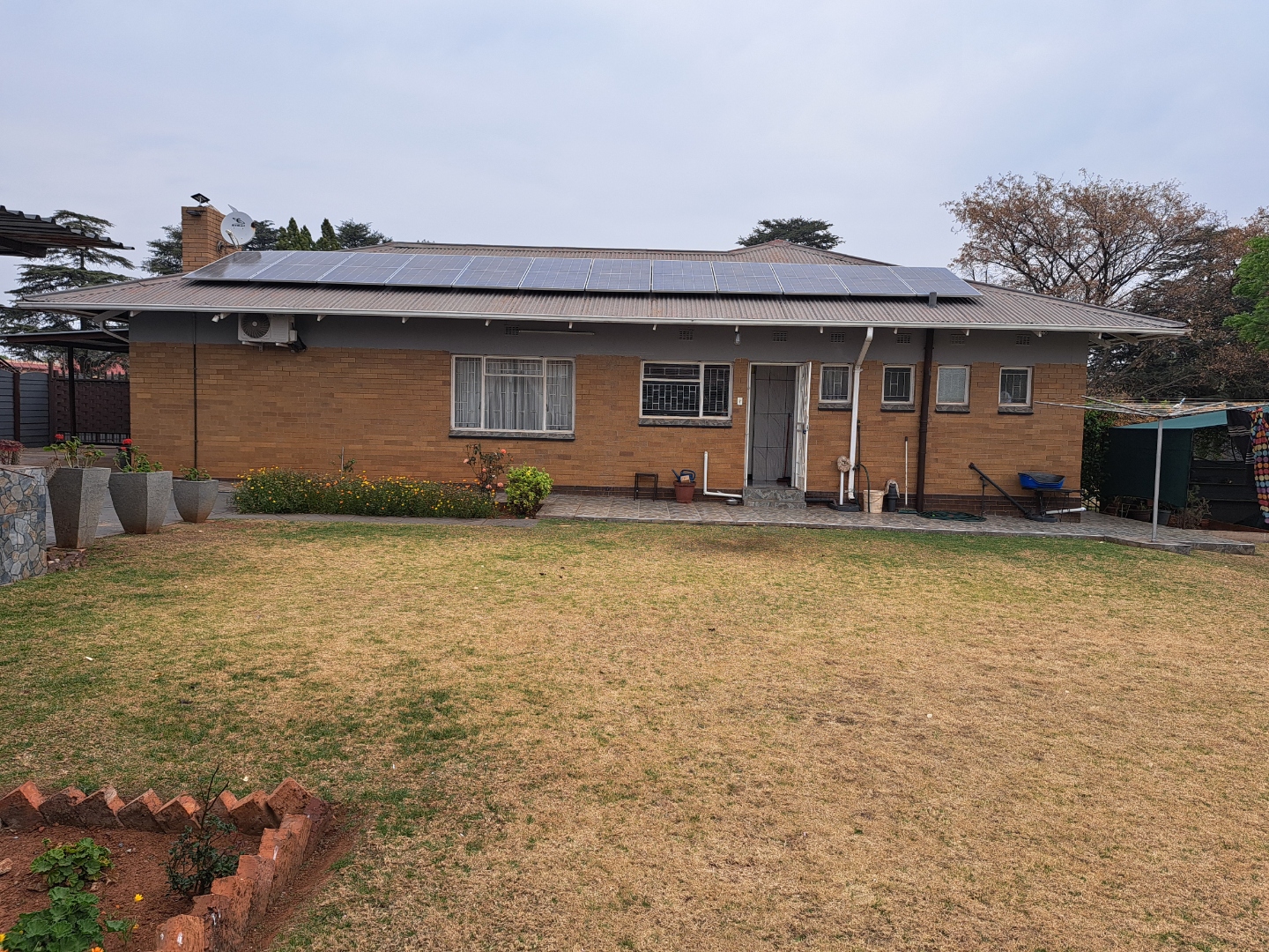 A 3 bedroom family house set on a big stand, close to Carleton Jones High School. Move in ready and very neat. Braai outside for weekend visits. 2 Outside rooms and single garage. 12 Solar Panels. 2 Jojo tanks.