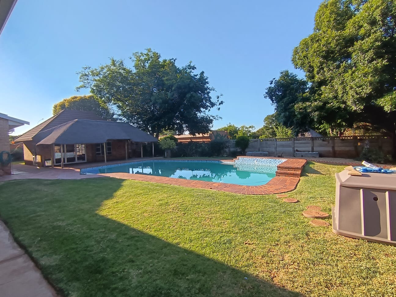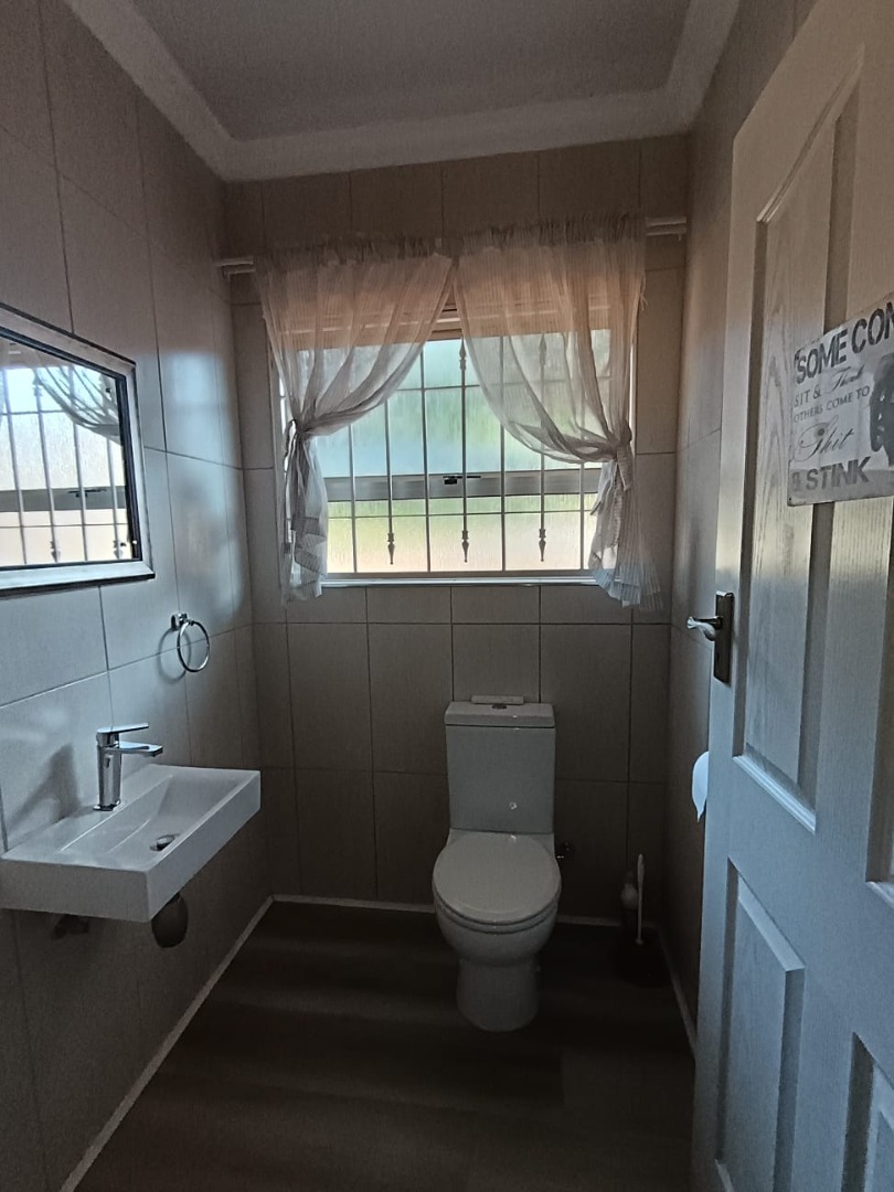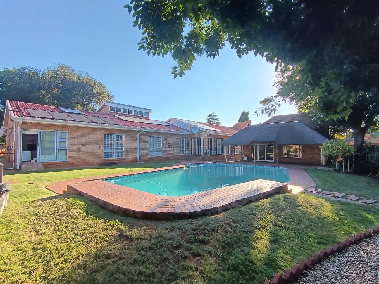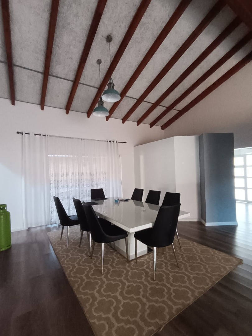 Discover this inviting family home located in the heart of Carletonville Central, offering a blend of spacious living and outdoor entertainment. The property immediately impresses with its established garden and brick construction, providing a welcoming kerb appeal. Inside, the residence boasts an open-plan design, highlighted by high vaulted ceilings with exposed wooden beams and modern laminate flooring, creating an airy and contemporary atmosphere. The layout includes two comfortable lounges and a dedicated dining area, perfect for family gatherings and entertaining. The well-appointed kitchen features a convenient pantry, ensuring ample storage and functionality. With four generously sized bedrooms and three bathrooms, including one en-suite, this home caters to family comfort. An additional guest toilet and a dedicated study provide extra convenience and versatility for work or hobbies. The interiors are designed for practical living, offering a seamless flow between spaces. Step outside to a private oasis featuring a large swimming pool, ideal for relaxation and recreation. The separate thatched lapa and built-in braai area provide the perfect setting for outdoor entertaining, complemented by the mature, established garden. Parking is abundant with three garages and six additional open parking spaces, ensuring ample room for vehicles. Pets are welcome, making this a true family-friendly environment. Security is a top priority, with features such as 24-hour security, an alarm system, electric fencing, burglar bars, a security gate, CCTV, and an intercom system. The home also embraces sustainability with a solar geyser, solar panels, a battery inverter, and water tanks, contributing to energy efficiency and water resilience. Fibre connectivity is available, ensuring modern communication needs are met. Carletonville Central offers a convenient suburban lifestyle, providing access to local amenities and a sense of community. This property is an excellent opportunity for those seeking a secure, spacious, and well-equipped family home in a desirable location. Key Features: * 4 Bedrooms, 3 Bathrooms (1 En-suite) * 2 Lounges, 1 Dining Room * Large Swimming Pool & Thatched Lapa * 3 Garages & 6 Parking Spaces * Solar Panels, Inverter & Water Tanks * 24-Hour Security, Alarm & CCTV * Fibre Connectivity * Built-in Braai & Established Garden * Dedicated Study & Pantry * Pets Allowed