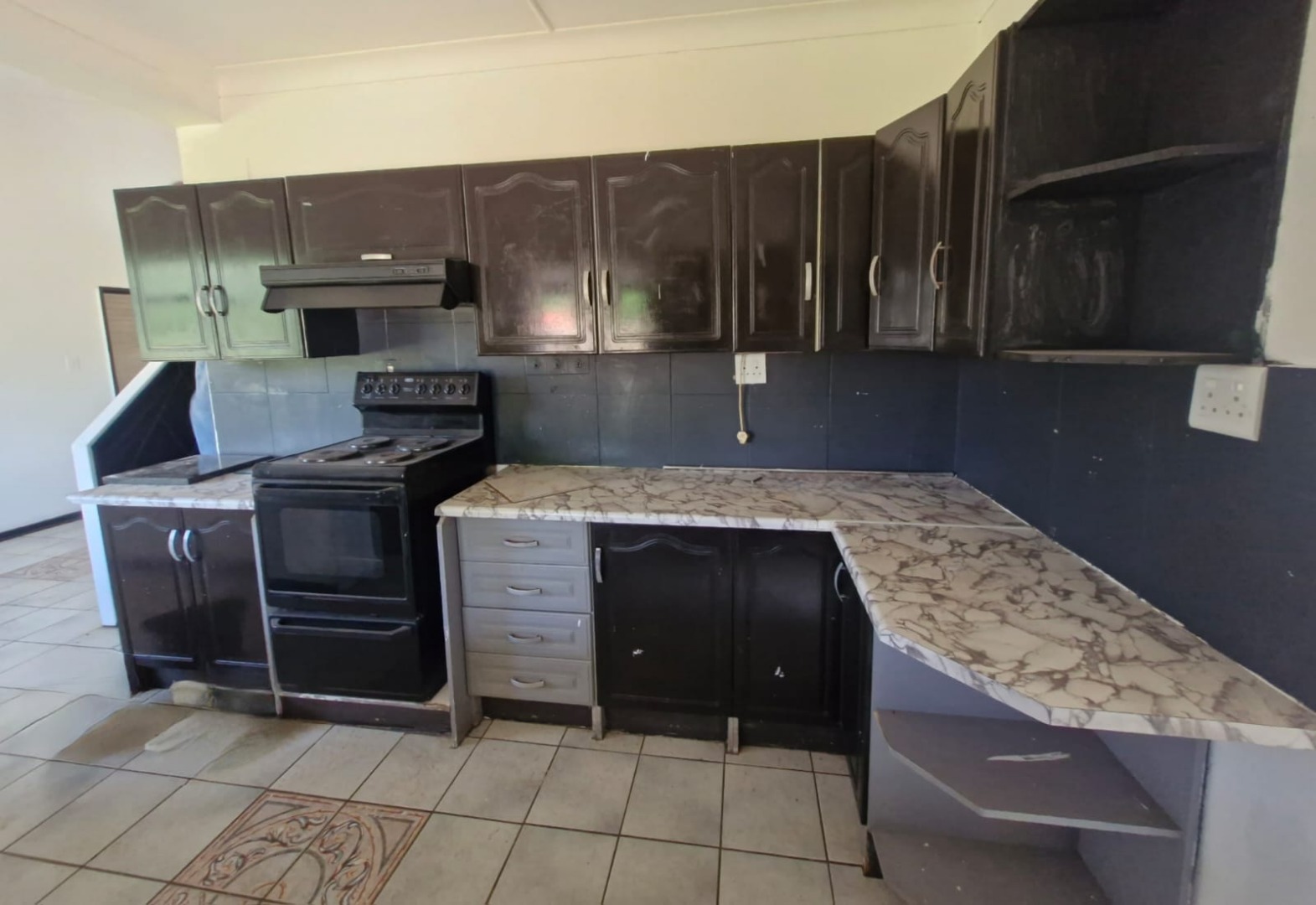 Spacious 5-bedroom house with 2 bathrooms (main en-suite), featuring an open-plan living and dining area, functional kitchen, and separate laundry.