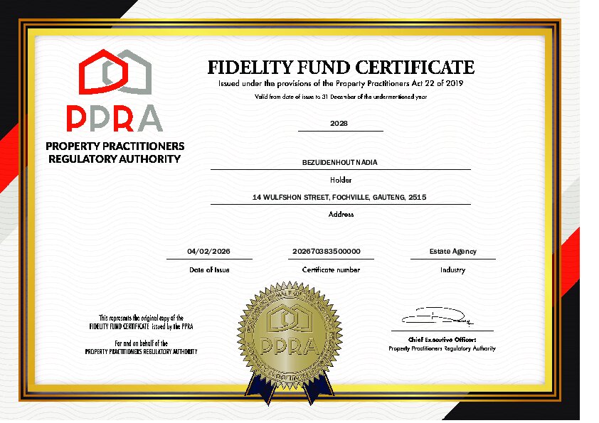 About Nadia Bezuidenhout Title: Candidate Property Practitioner Registered with the PPRA FFC Number: 202670383500000