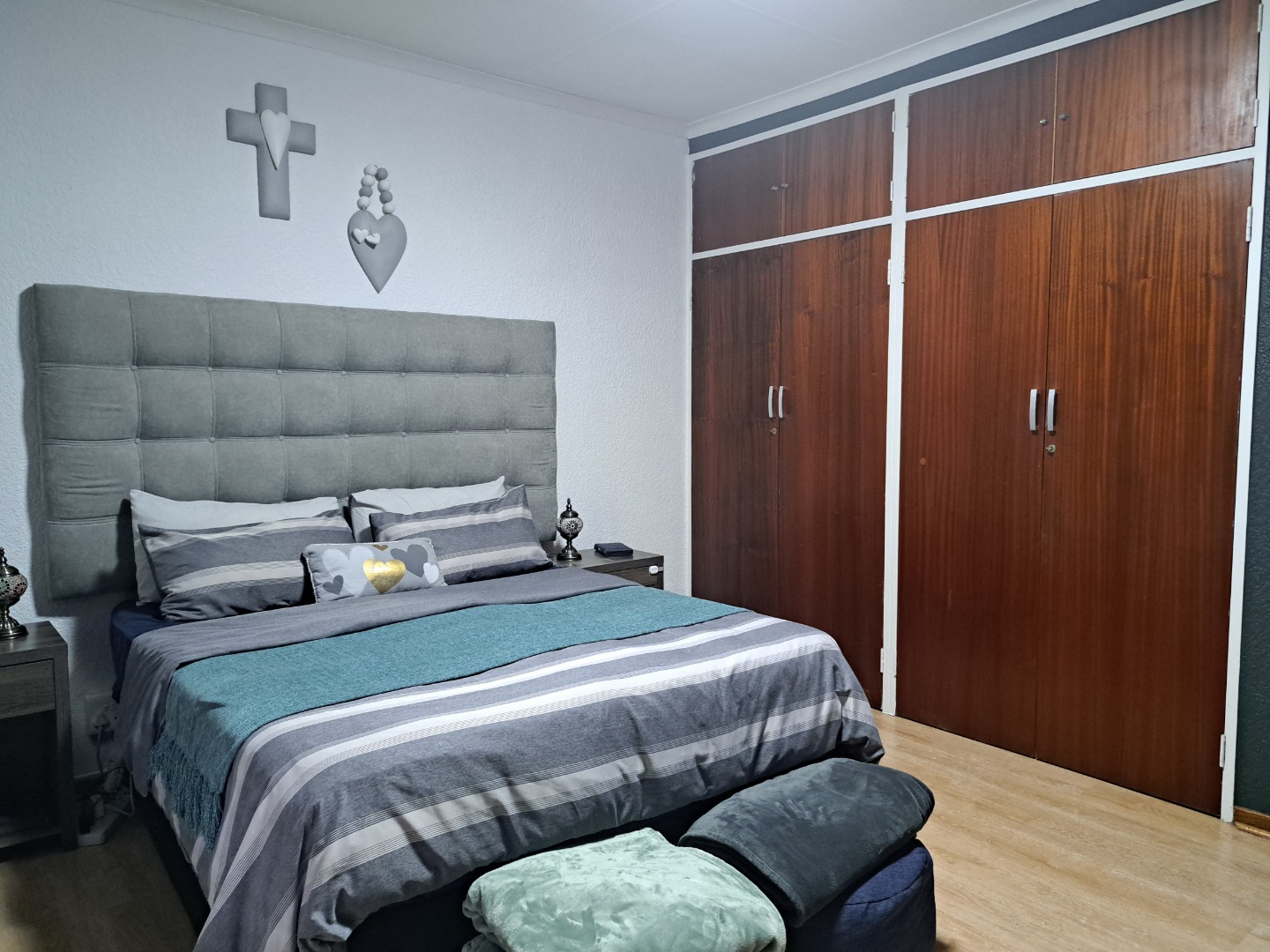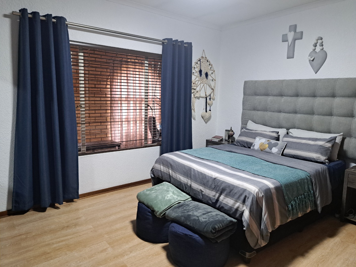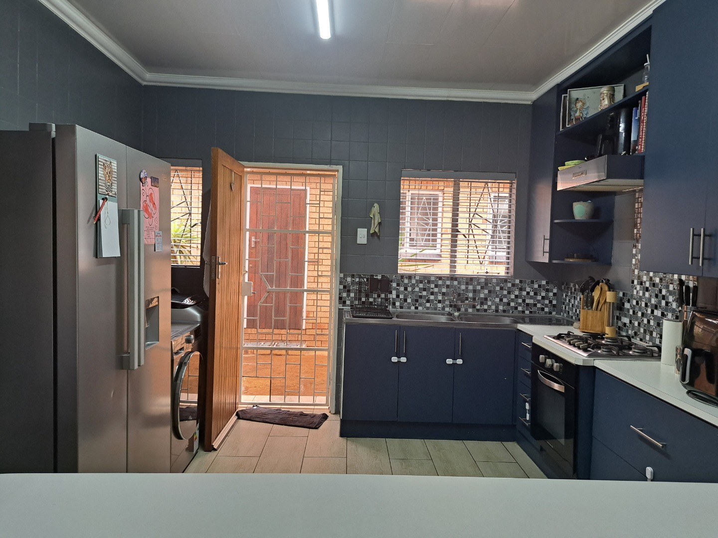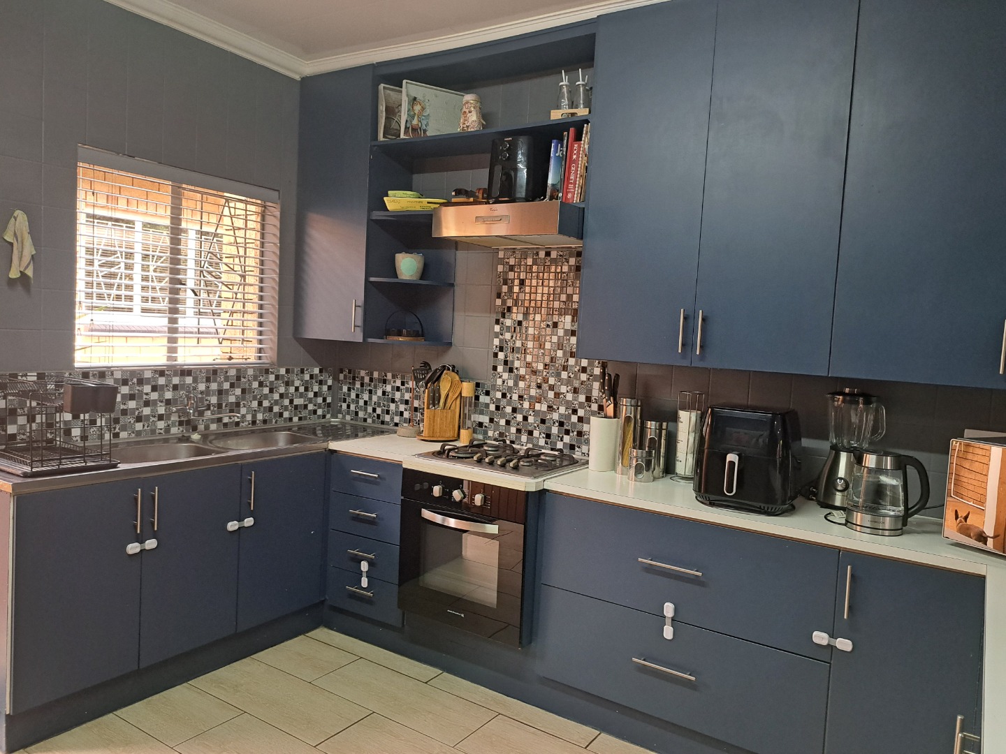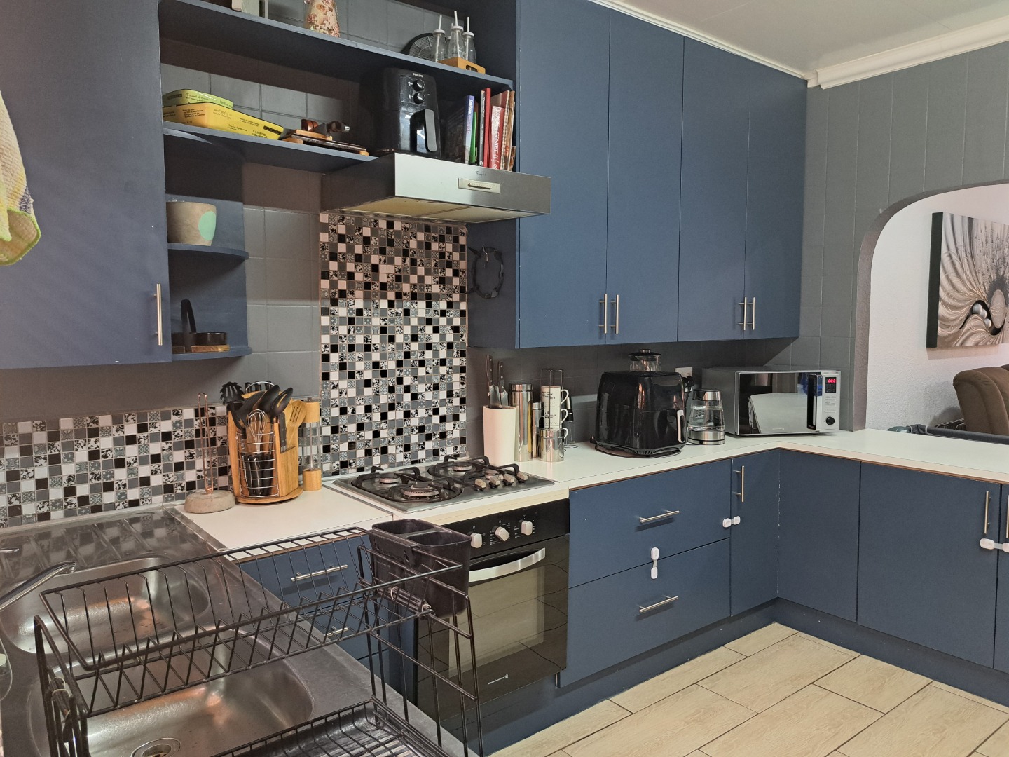 This inviting 92 sqm home, situated in the established suburban area of Carletonville Central, South Africa, offers comfortable living with modern touches. The interior features a welcoming living room with a striking dark teal accent wall, a wall-mounted TV, and ample seating. Arched doorways enhance the open feel, complemented by tiled flooring and a ceiling fan. A versatile enclosed patio, currently a home office, provides abundant natural light through multiple windows and showcases charming exposed brick walls, ideal for a sunroom or study. The contemporary kitchen is equipped with stylish navy blue cabinetry, contrasting white countertops, and an integrated gas hob and oven. A double sink and a distinctive mosaic tile backsplash add to its appeal, while ample storage and space for a washing machine ensure practicality. Security features, including burglar bars on windows and a security gate on the exterior door, provide peace of mind. The residence comprises two comfortable bedrooms and one well-appointed bathroom. One bedroom features modern dark grey walls, wood-look laminate flooring, and extensive built-in wardrobes. The second bedroom offers a cozy ambiance with a contemporary grey padded headboard, coordinated bedding, and practical laminate wood flooring, with windows fitted for light control and privacy. Externally, the property includes a double garage and an additional parking space. Direct access from a living area to a small outdoor garden area offers a private space for relaxation. This home combines functional design with appealing aesthetics. Key Features: * Two Bedrooms * One Bathroom * Modern Navy Blue Kitchen * Integrated Gas Hob & Oven * Double Garage * Versatile Enclosed Patio * Tiled & Laminate Flooring * Security Gates & Bars * Suburban Carletonville Central
