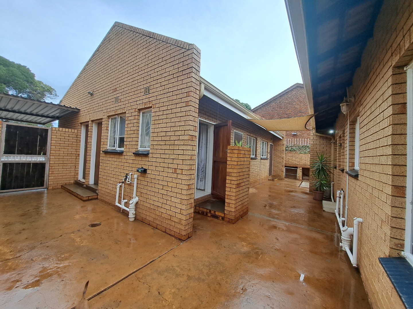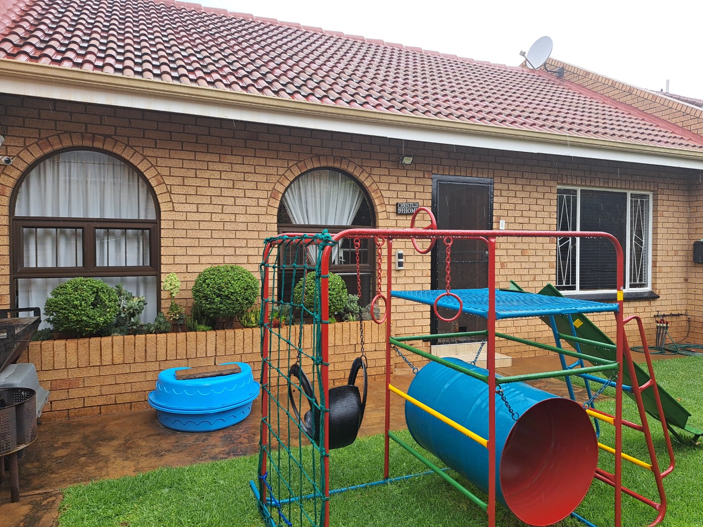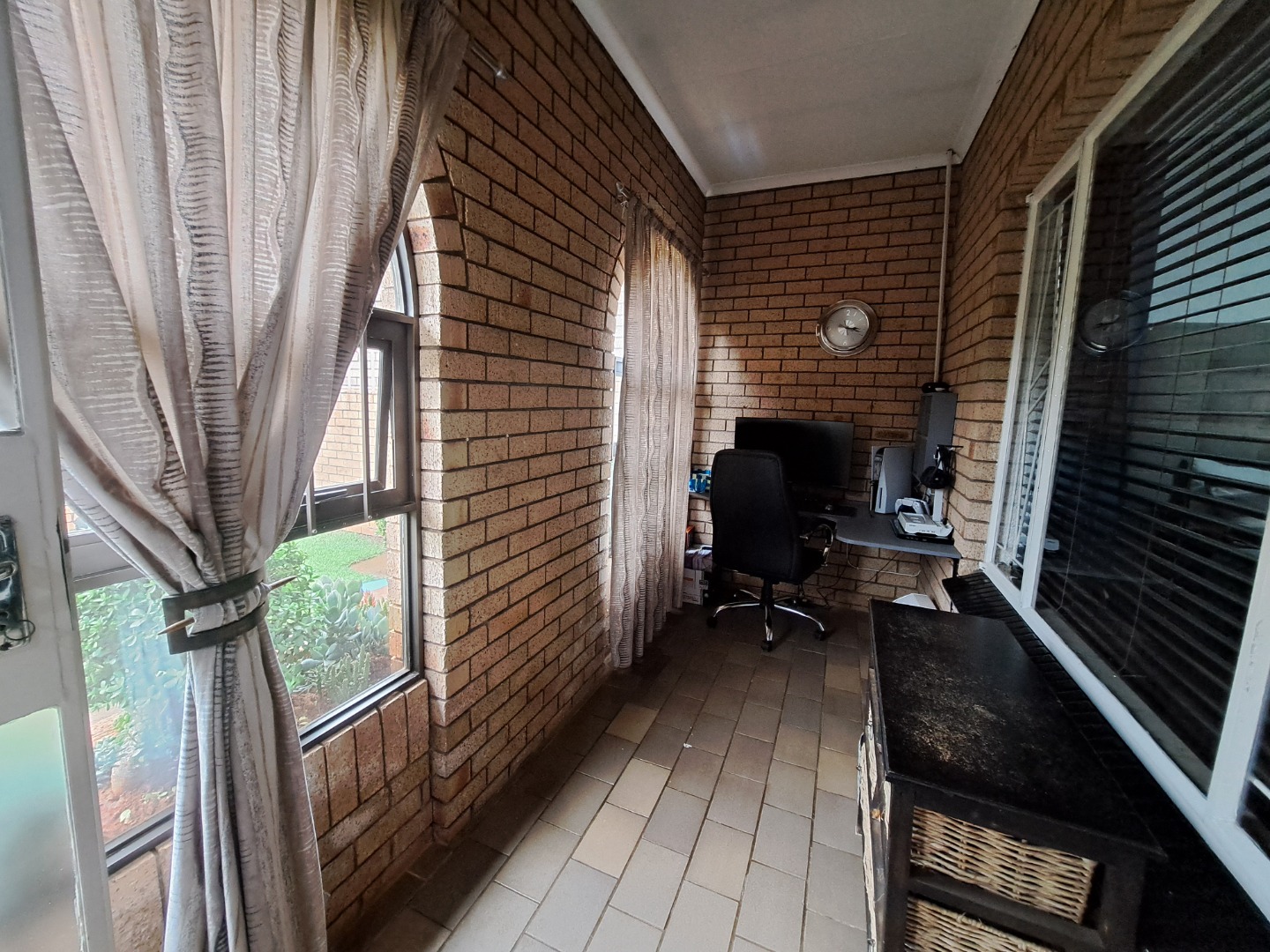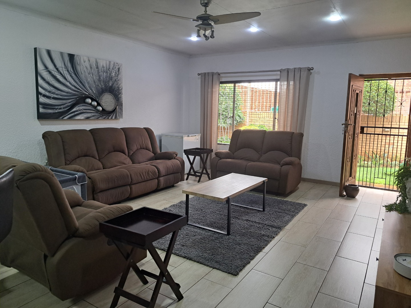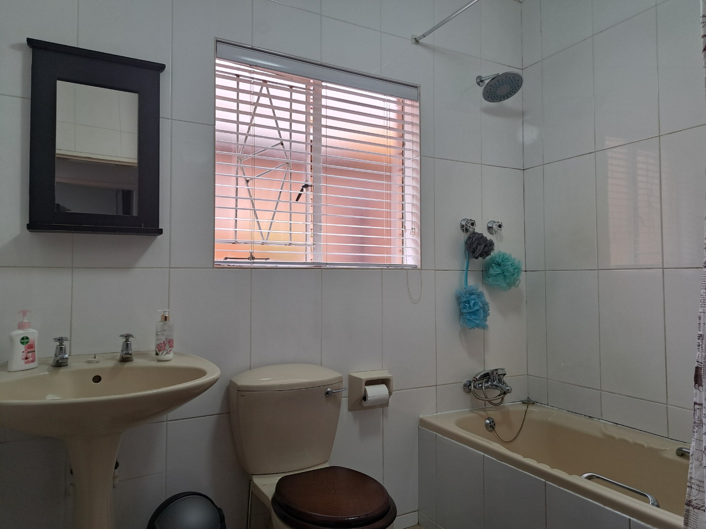 This inviting 92 sqm home, situated in the established suburban area of Carletonville Central, South Africa, offers comfortable living with modern touches. The interior features a welcoming living room with a striking dark teal accent wall, a wall-mounted TV, and ample seating. Arched doorways enhance the open feel, complemented by tiled flooring and a ceiling fan. A versatile enclosed patio, currently a home office, provides abundant natural light through multiple windows and showcases charming exposed brick walls, ideal for a sunroom or study. The contemporary kitchen is equipped with stylish navy blue cabinetry, contrasting white countertops, and an integrated gas hob and oven. A double sink and a distinctive mosaic tile backsplash add to its appeal, while ample storage and space for a washing machine ensure practicality. Security features, including burglar bars on windows and a security gate on the exterior door, provide peace of mind. The residence comprises two comfortable bedrooms and one well-appointed bathroom. One bedroom features modern dark grey walls, wood-look laminate flooring, and extensive built-in wardrobes. The second bedroom offers a cozy ambiance with a contemporary grey padded headboard, coordinated bedding, and practical laminate wood flooring, with windows fitted for light control and privacy. Externally, the property includes a double garage and an additional parking space. Direct access from a living area to a small outdoor garden area offers a private space for relaxation. This home combines functional design with appealing aesthetics. Key Features: * Two Bedrooms * One Bathroom * Modern Navy Blue Kitchen * Integrated Gas Hob & Oven * Double Garage * Versatile Enclosed Patio * Tiled & Laminate Flooring * Security Gates & Bars * Suburban Carletonville Central