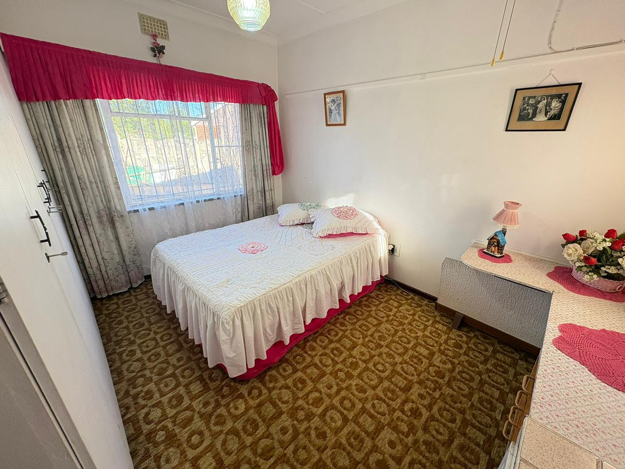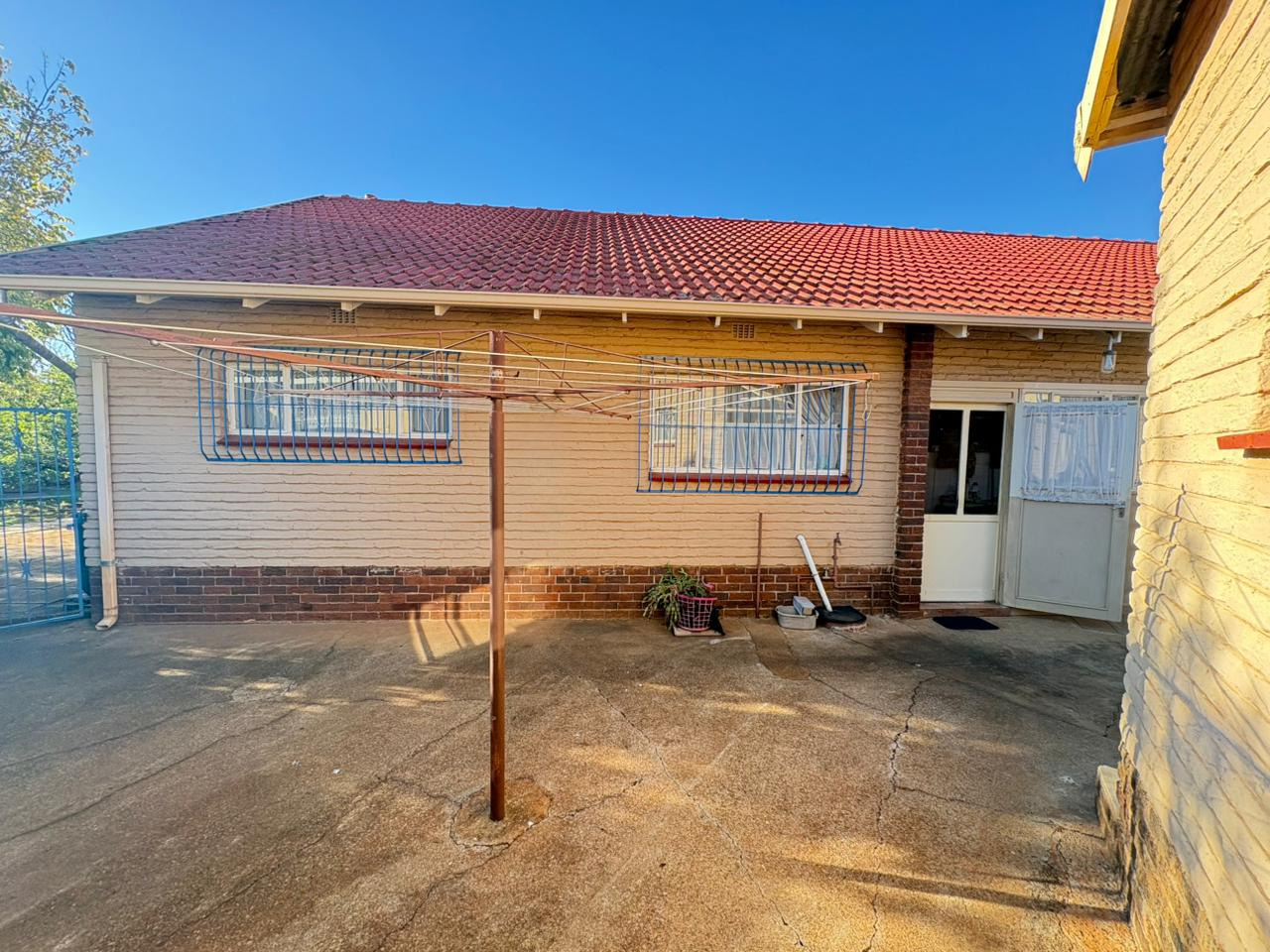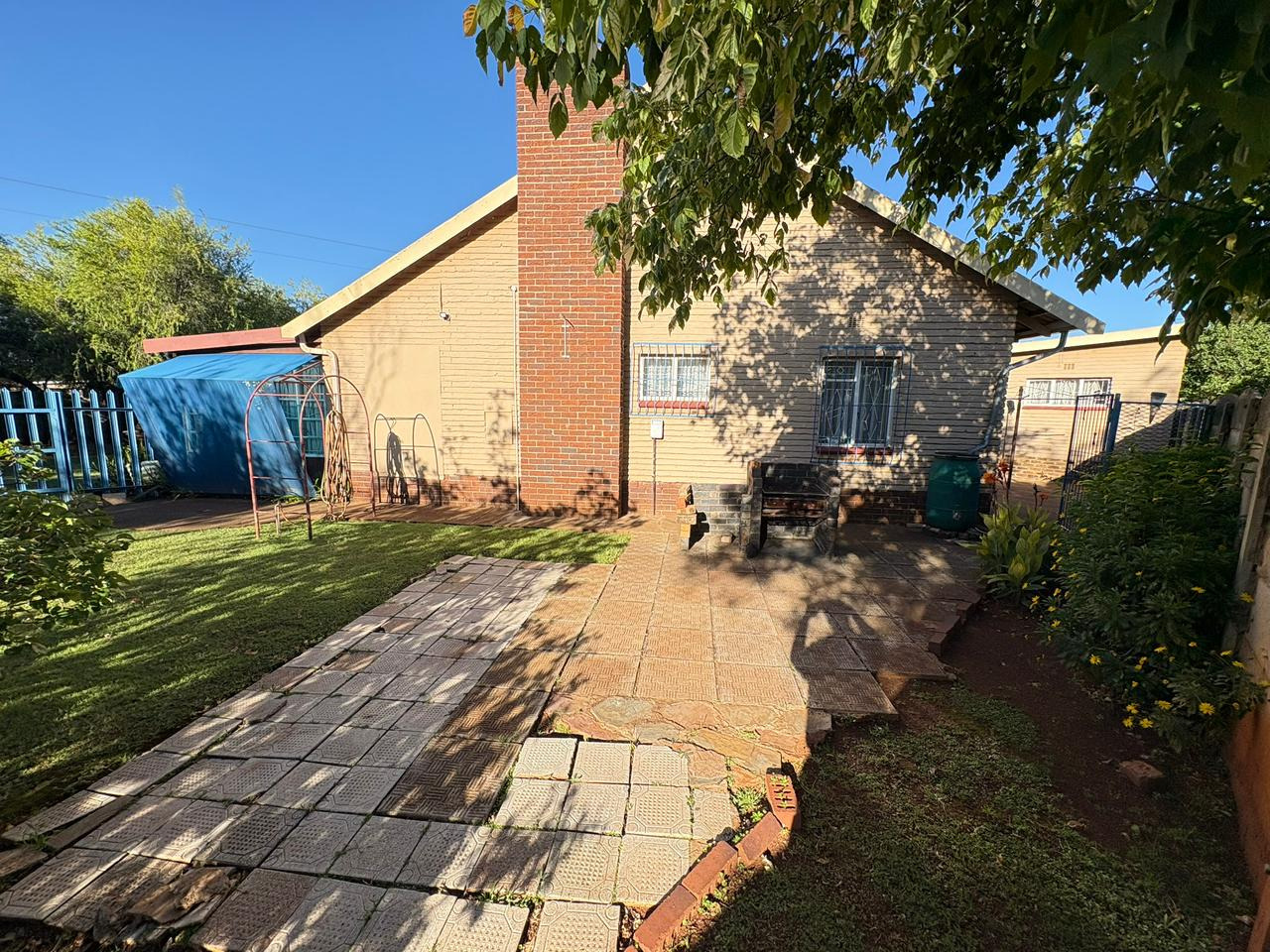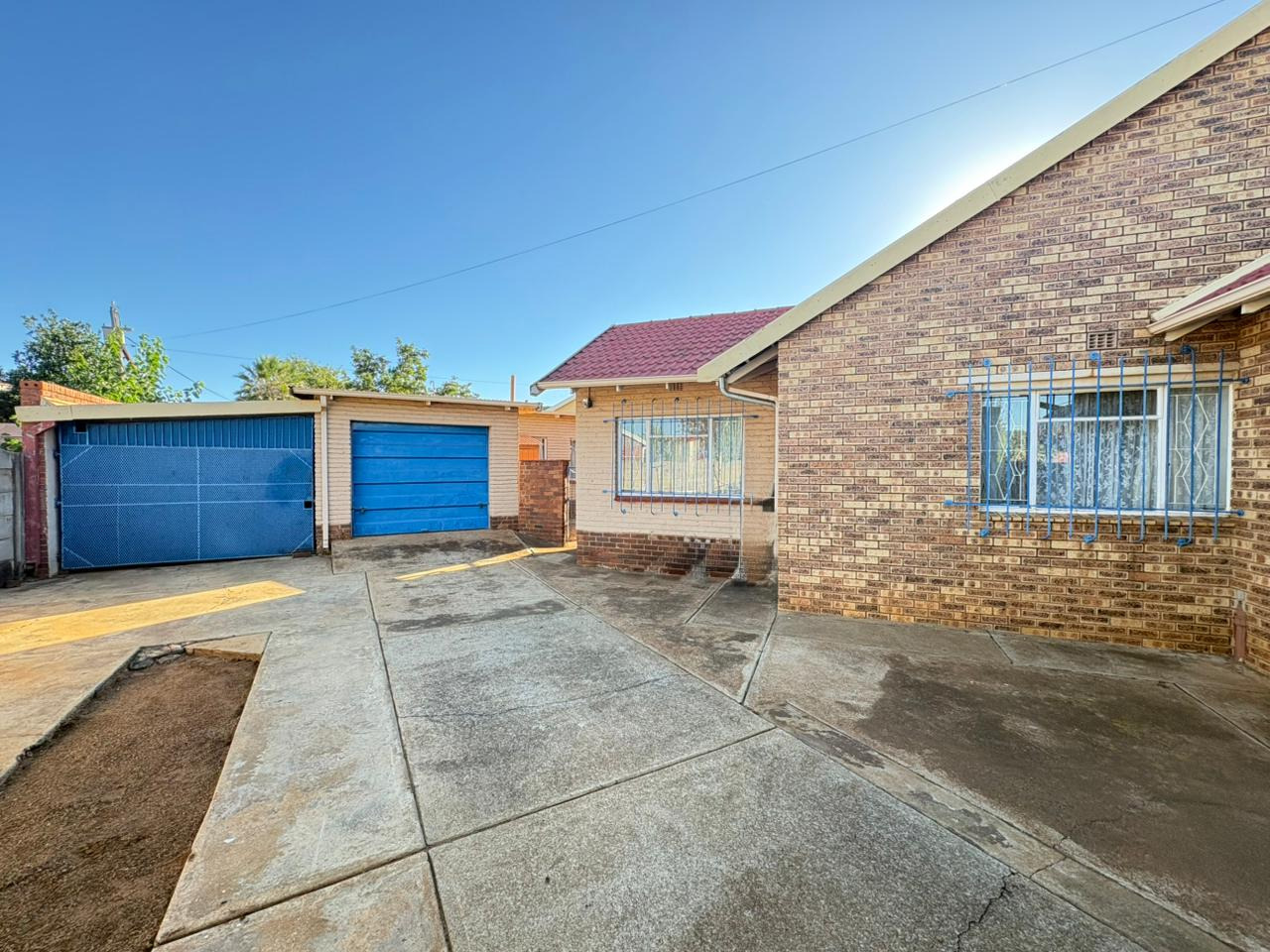 Discover this charming single-story brick home, ideally situated in the established suburb of Carletonville. The property immediately impresses with its well maintained front lawn, mature trees, and a prominent red tiled roof, exuding classic kerb appeal. A paved pathway leads to the entrance, complemented by security bars on windows for enhanced peace of mind.