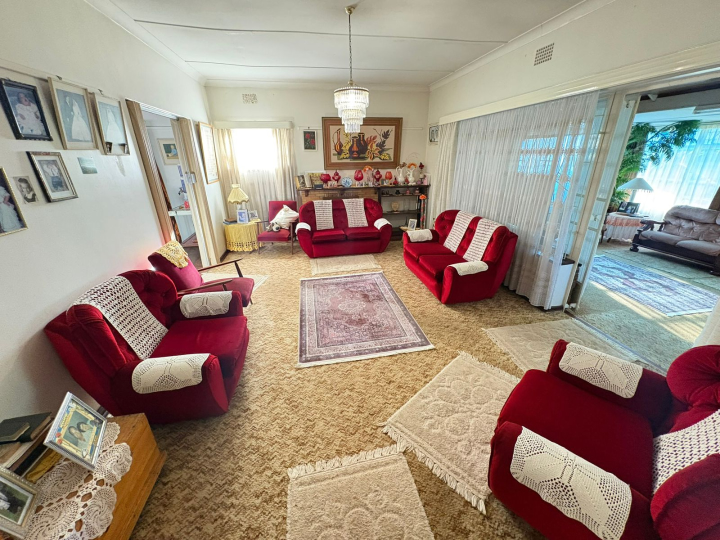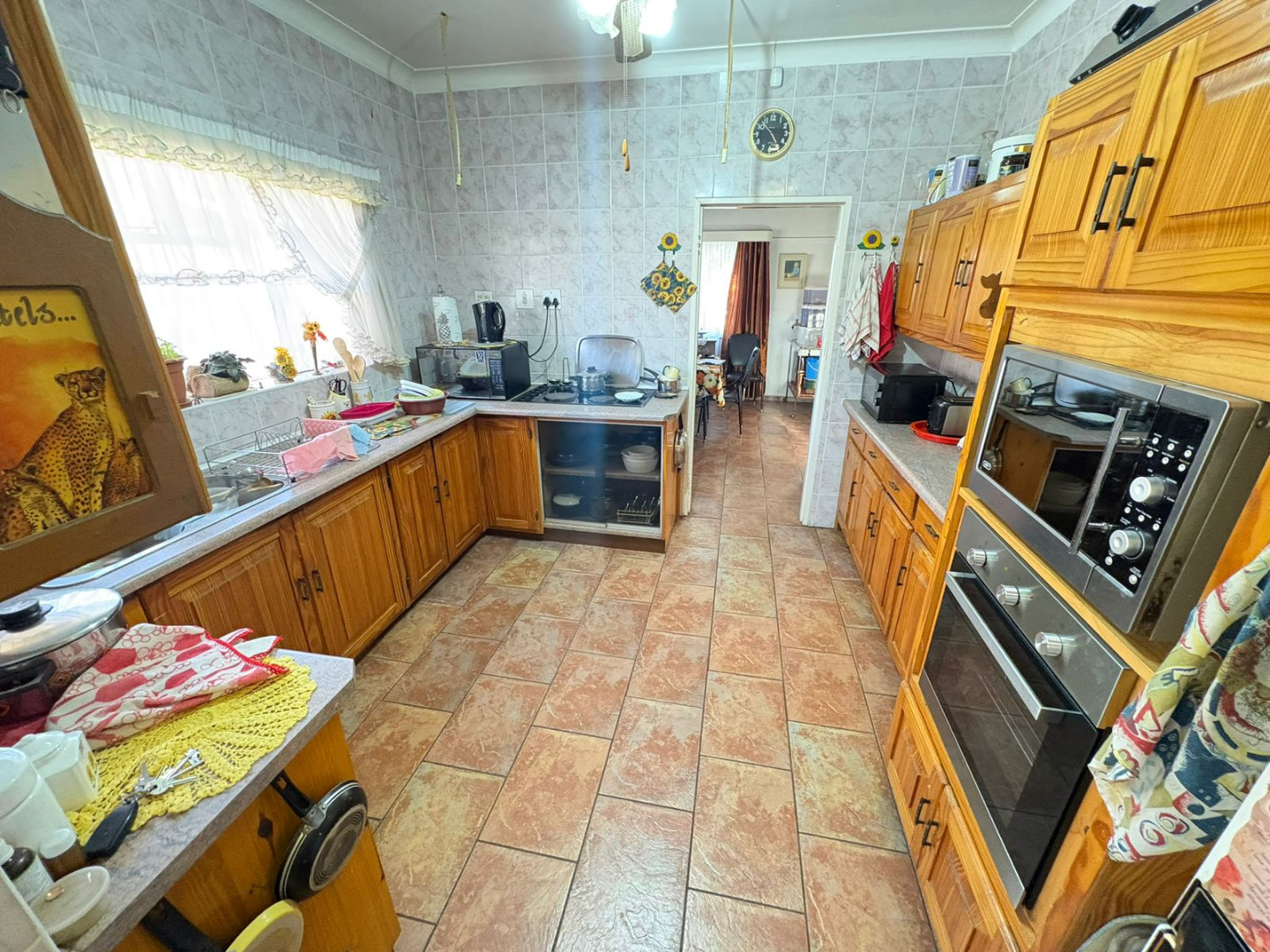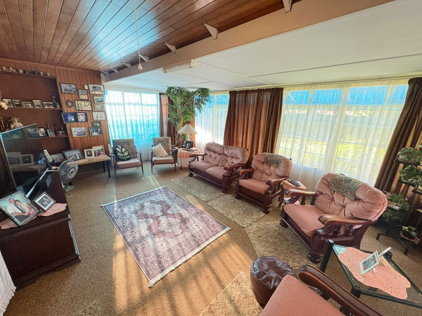 Inside, the residence offers a generous layout designed for comfortable family living. It features two spacious lounges and a dedicated dining room, providing ample space for both relaxation and entertaining. One living area boasts extensive wood paneling and large windows, creating a warm, naturally lit environment, further enhanced by practical built in shelving. The functional kitchen is equipped with abundant wooden cabinetry, a built in oven, offering a solid foundation for culinary pursuits.