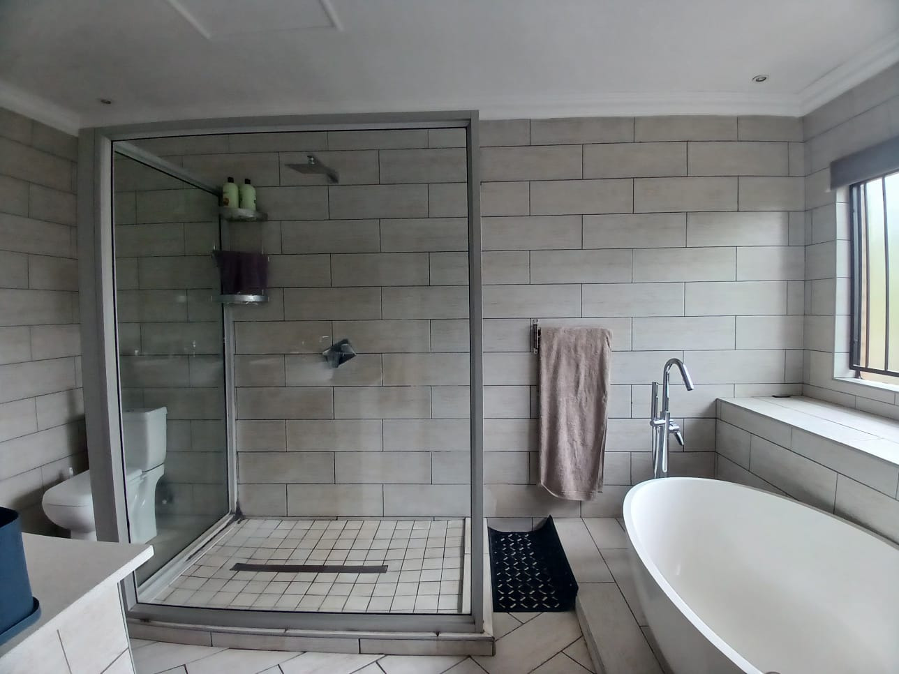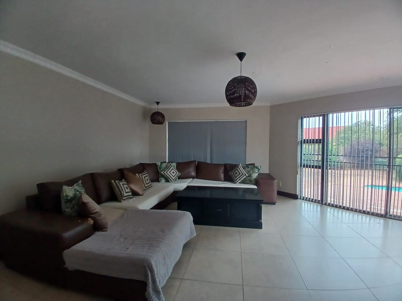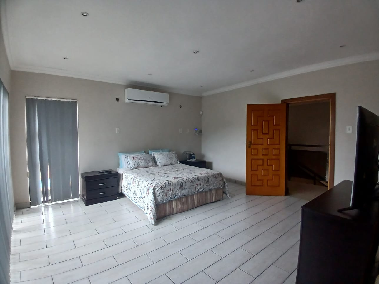 The interior boasts two generous lounges, one featuring a striking stone accent wall and direct access to the outdoor area, while the other offers abundant natural light and views of the swimming pool. A dedicated dining room and a U-shaped kitchen with an integrated breakfast bar provide excellent spaces for family meals and entertaining. The five bedrooms include an en-suite, with rooms offering tiled flooring, air conditioning, and built-in cupboards, ensuring comfort and practicality. The bathrooms are well-equipped, featuring a spacious glass-enclosed shower, a freestanding soaking tub, and a double vanity in one.
