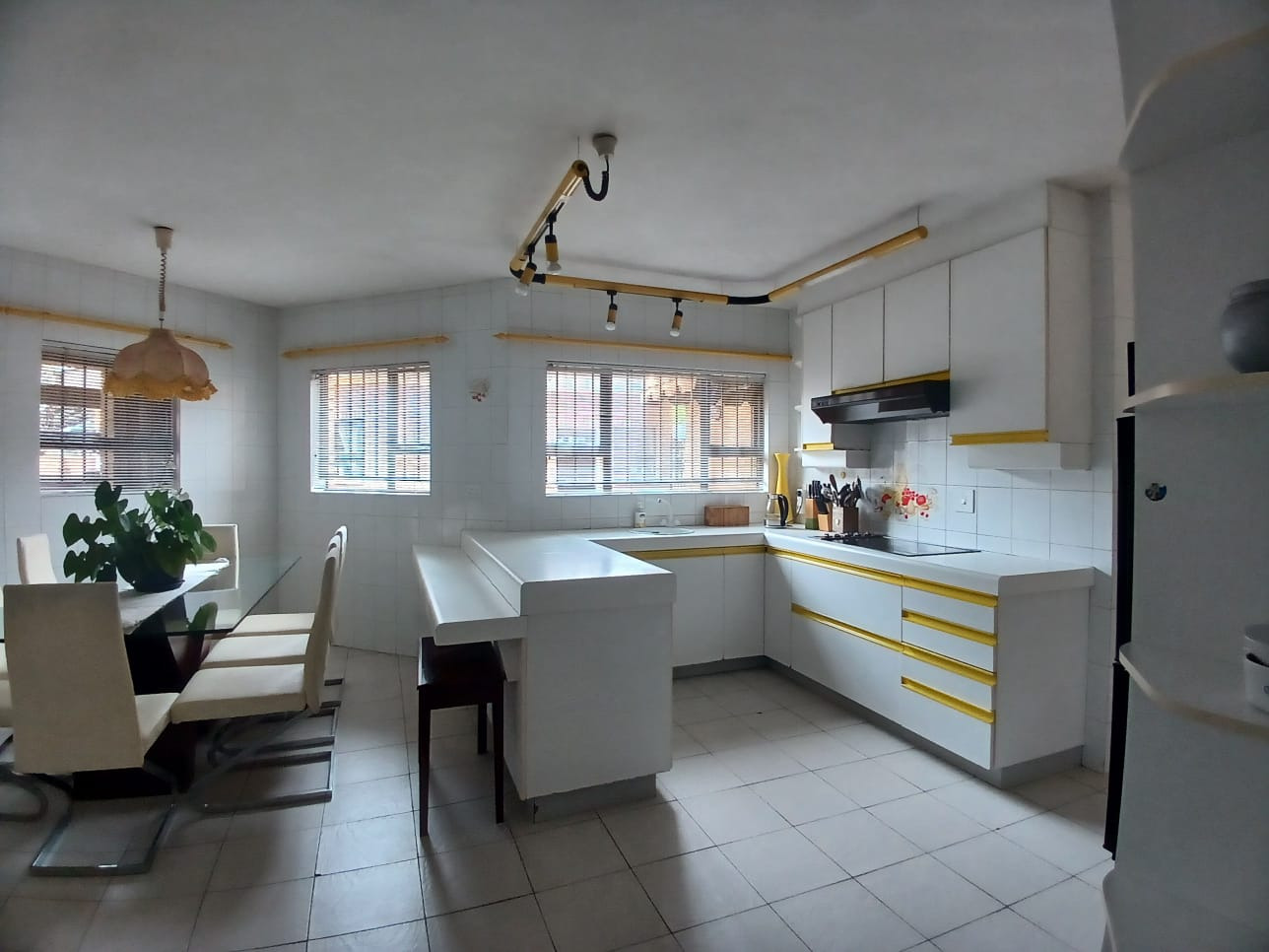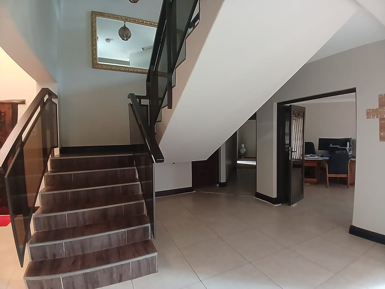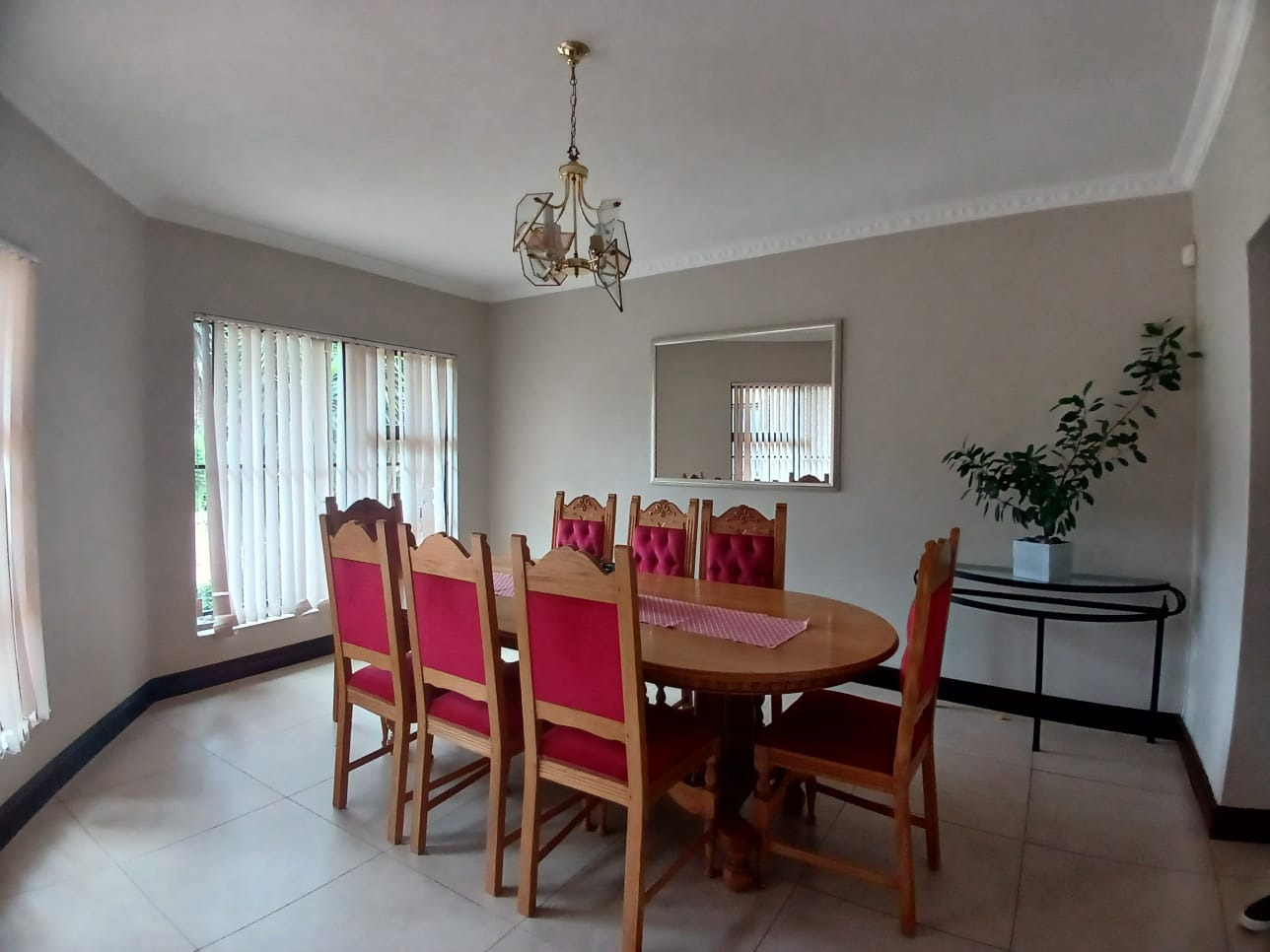 The interior boasts two generous lounges, one featuring a striking stone accent wall and direct access to the outdoor area, while the other offers abundant natural light and views of the swimming pool. A dedicated dining room and a U-shaped kitchen with an integrated breakfast bar provide excellent spaces for family meals and entertaining. The five bedrooms include an en-suite, with rooms offering tiled flooring, air conditioning, and built-in cupboards, ensuring comfort and practicality. The bathrooms are well-equipped, featuring a spacious glass-enclosed shower, a freestanding soaking tub, and a double vanity in one.