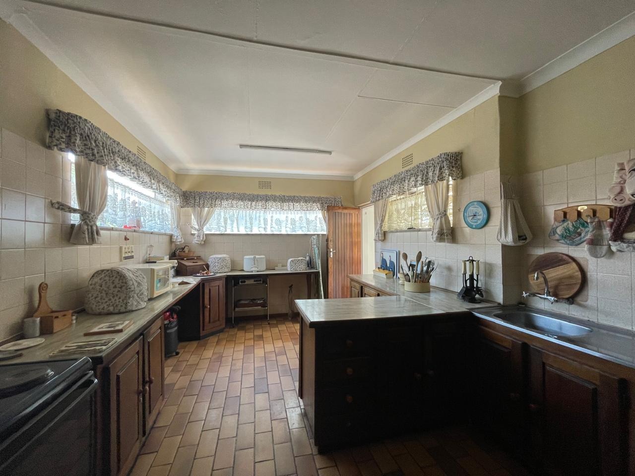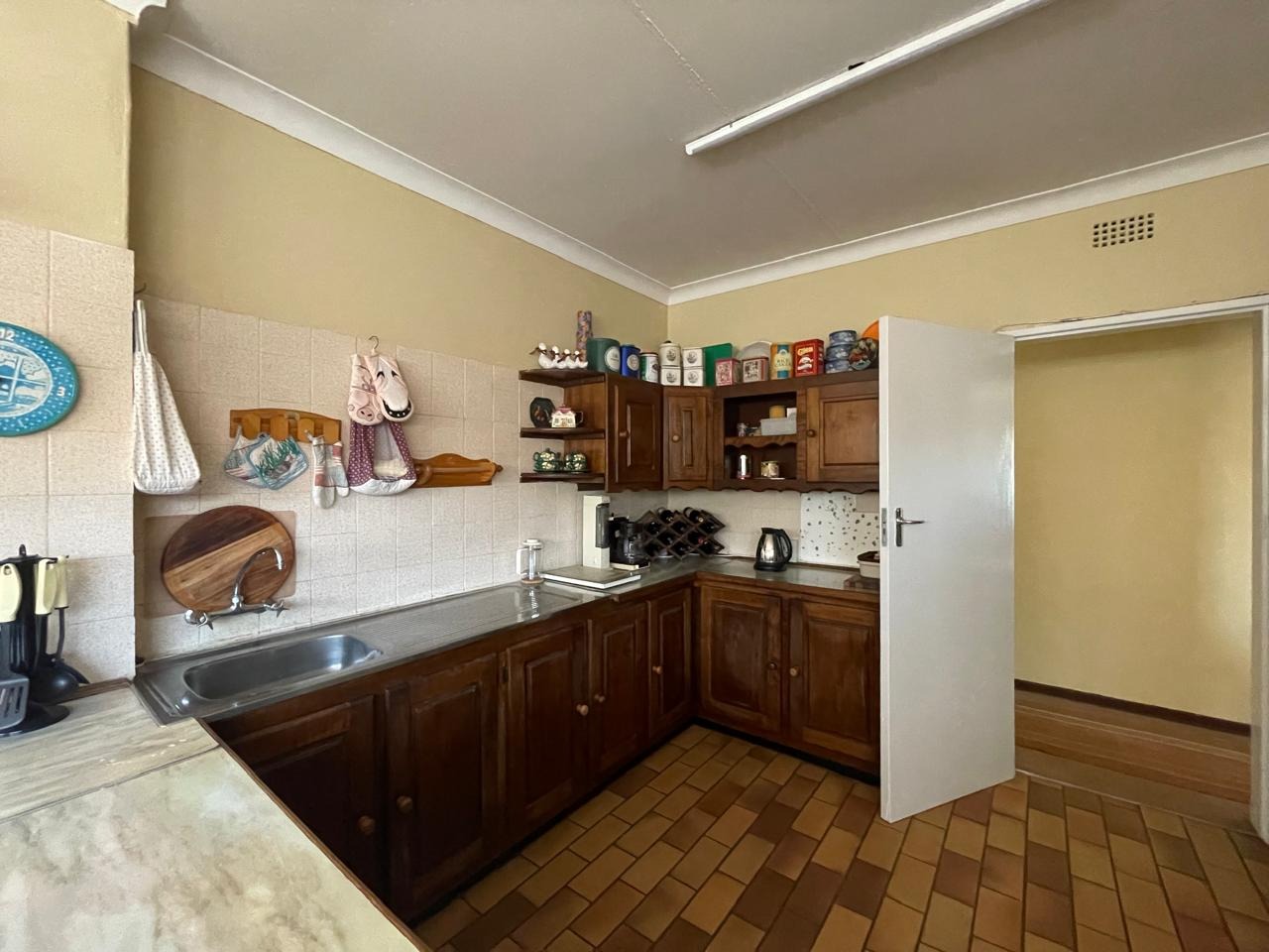 Inside, the residence boasts multiple living areas, including a spacious lounge and a dedicated family TV room, providing ample space for relaxation and entertainment. Architectural details like crown molding and arched doorways add character to the interior. The functional kitchen features extensive dark wooden cabinetry, a tiled backsplash, and patterned floor tiles, offering practical storage and preparation space. While the interior presents a dated aesthetic, it offers a fantastic opportunity for modernisation to suit your personal style.