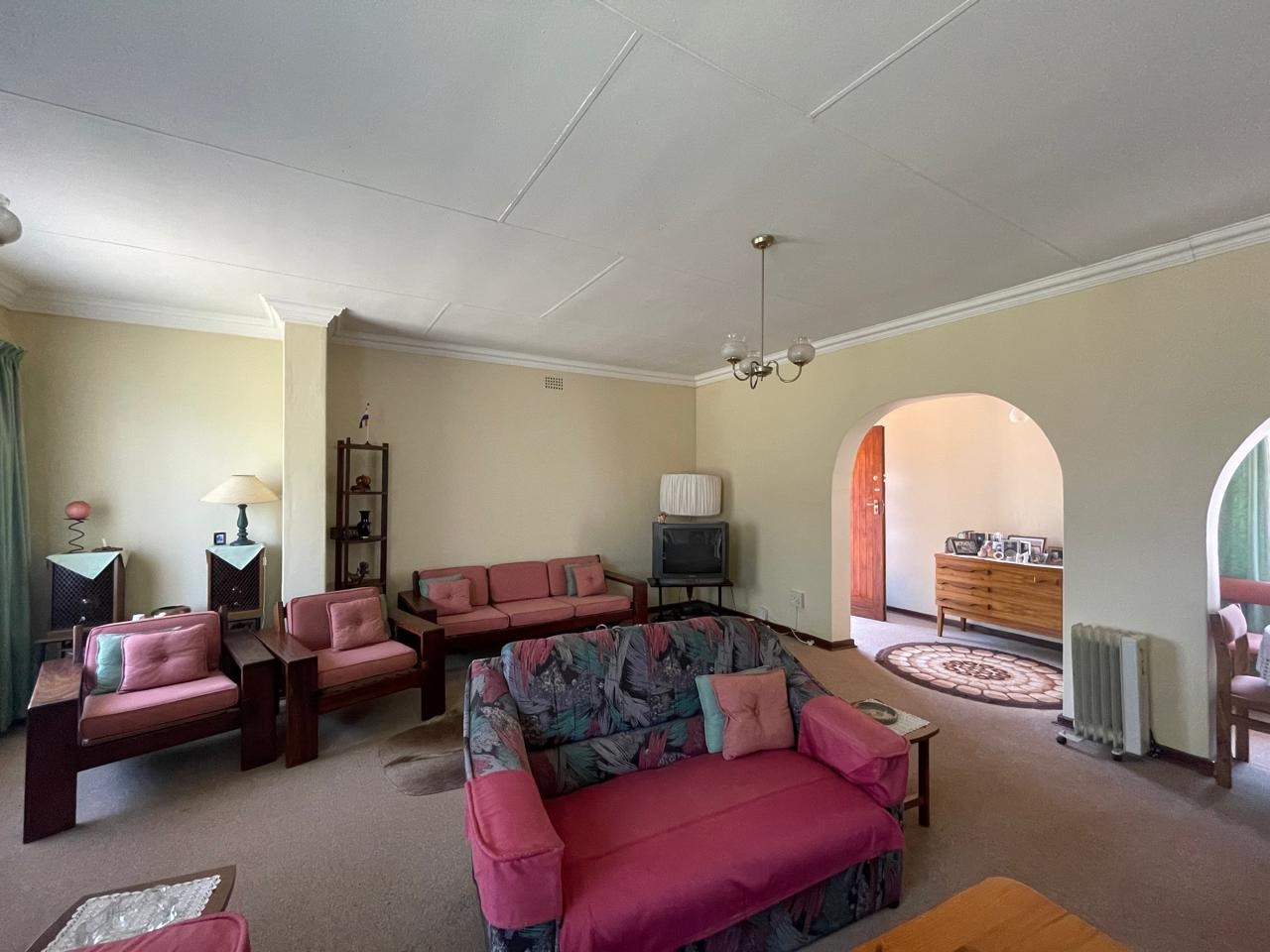 Inside, the residence boasts multiple living areas, including a spacious lounge and a dedicated family TV room, providing ample space for relaxation and entertainment. Architectural details like crown molding and arched doorways add character to the interior. The functional kitchen features extensive dark wooden cabinetry, a tiled backsplash, and patterned floor tiles, offering practical storage and preparation space. While the interior presents a dated aesthetic, it offers a fantastic opportunity for modernisation to suit your personal style.