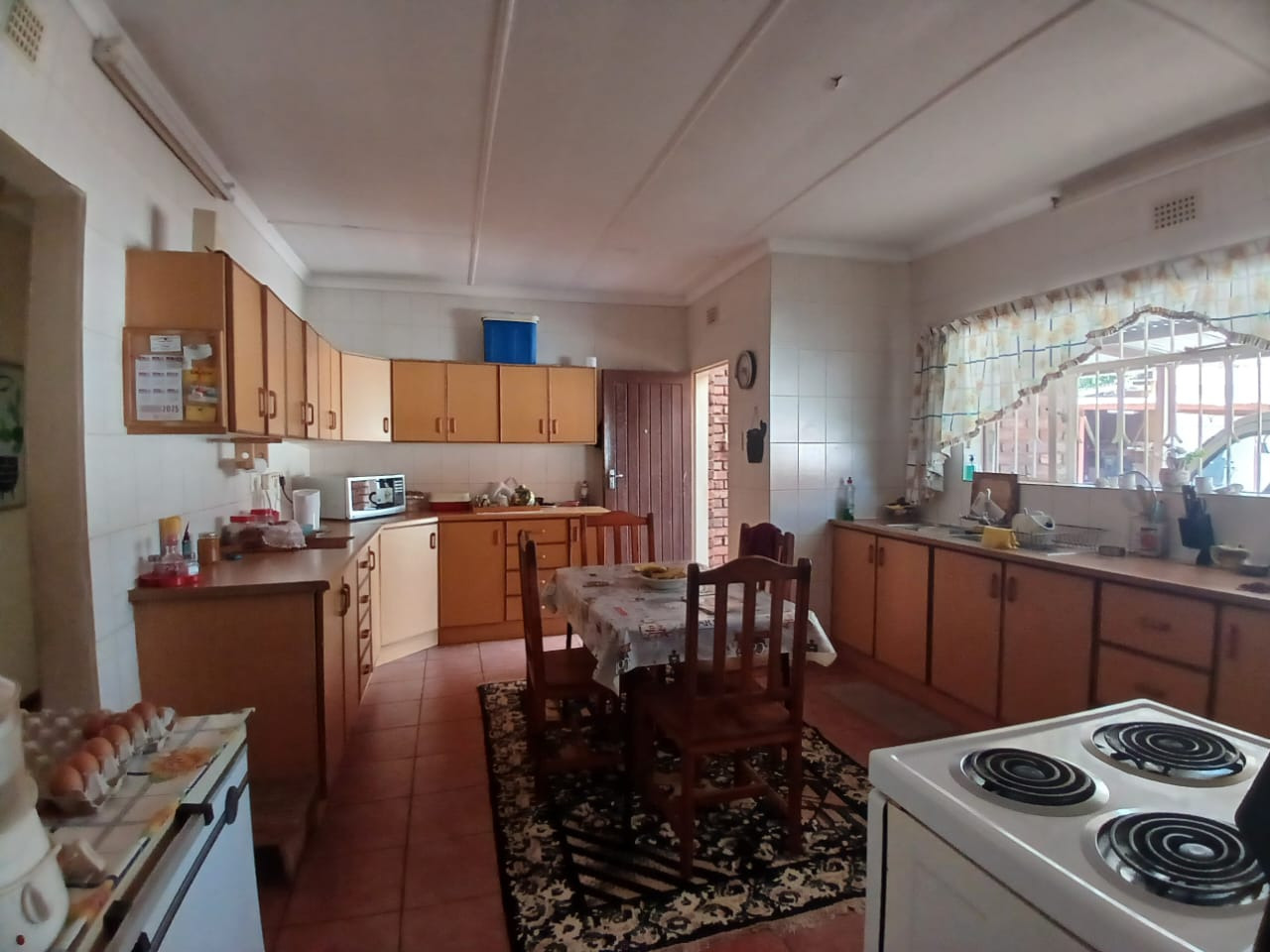Inside, the home presents a functional layout with a lounge, dining room, and a spacious kitchen. The lounge boasts durable tiled flooring and natural light, enhanced by a ceiling fan. The kitchen, with extensive light wood cabinetry and tiled floors, includes a dedicated dining area. Three comfortable bedrooms and two bathrooms, including an en-suite, offer practical built-in wardrobe storage and ceiling fans for comfort. A built-in bar adds to the entertainment potential.