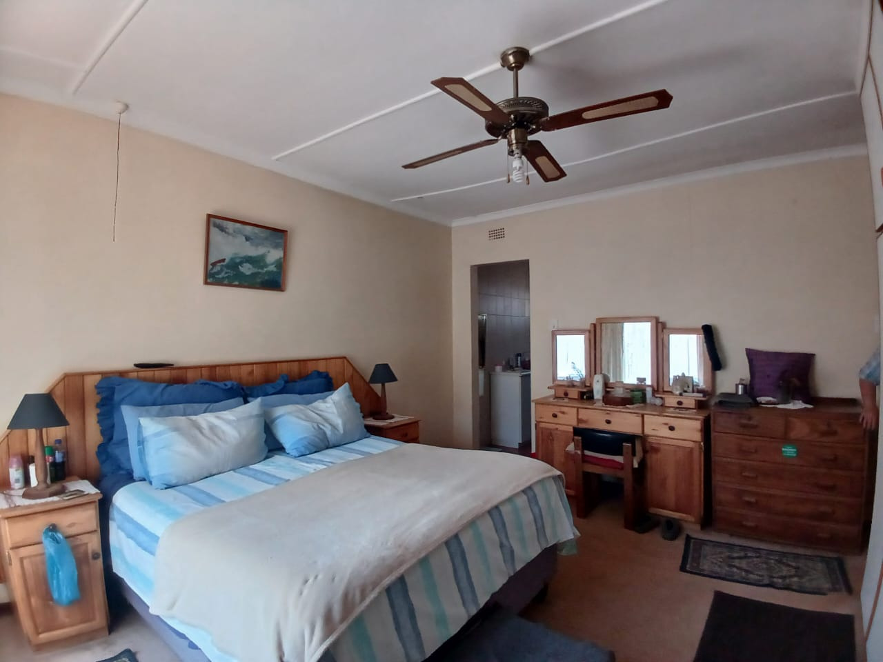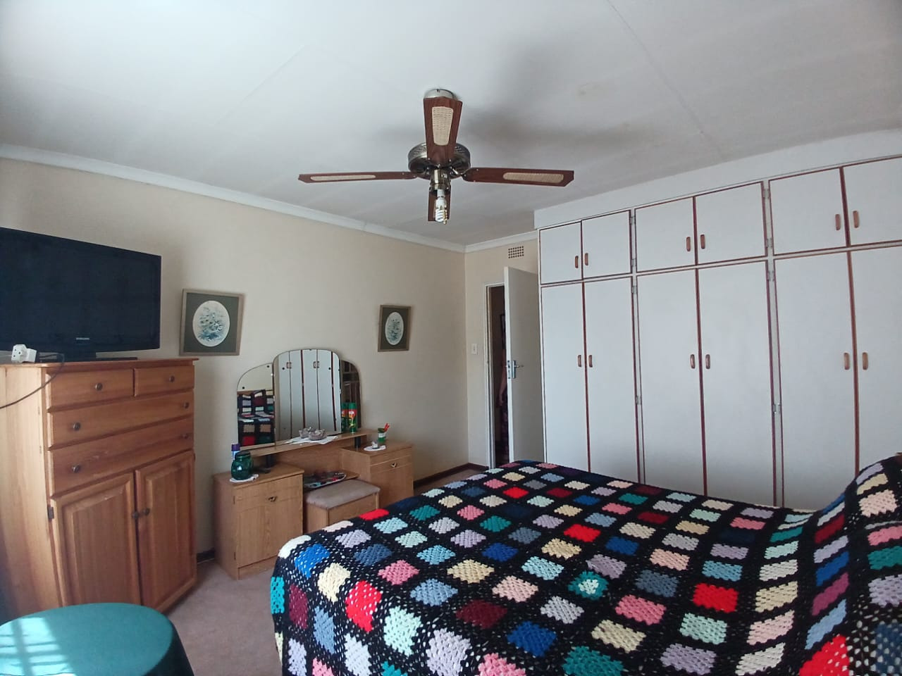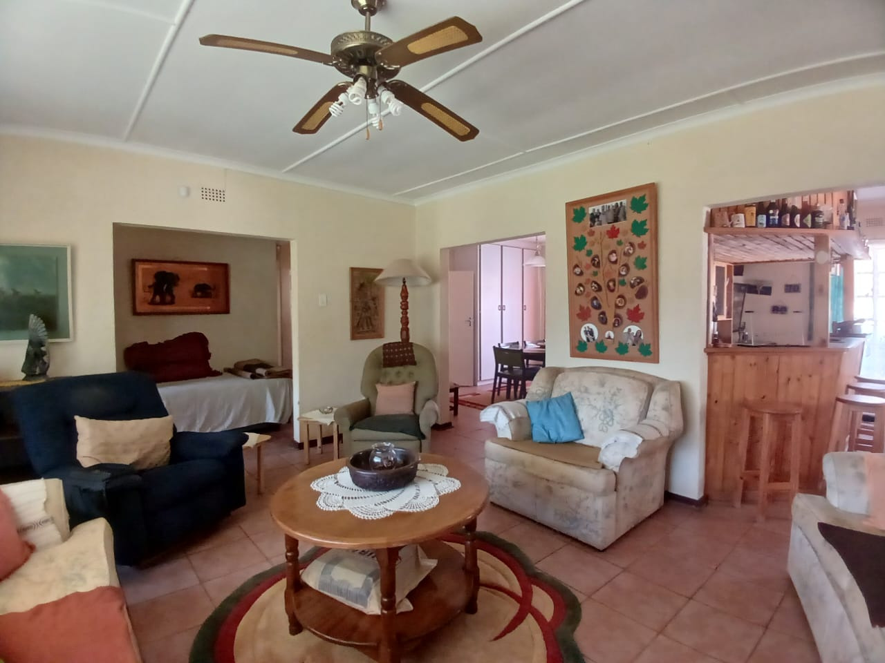 Inside, the home presents a functional layout with a lounge, dining room, and a spacious kitchen. The lounge boasts durable tiled flooring and natural light, enhanced by a ceiling fan. The kitchen, with extensive light wood cabinetry and tiled floors, includes a dedicated dining area. Three comfortable bedrooms and two bathrooms, including an en-suite, offer practical built-in wardrobe storage and ceiling fans for comfort. A built-in bar adds to the entertainment potential.